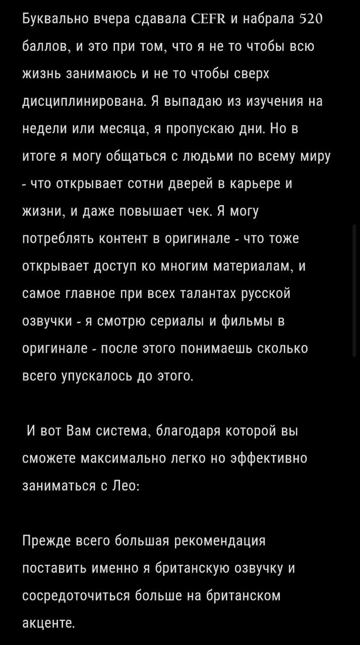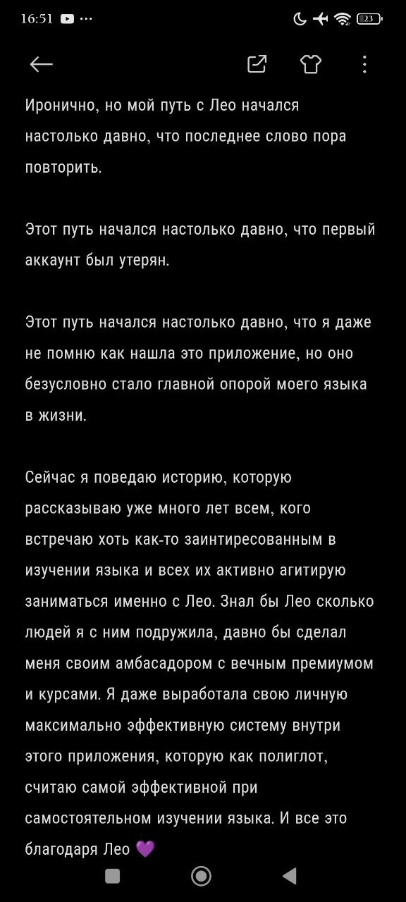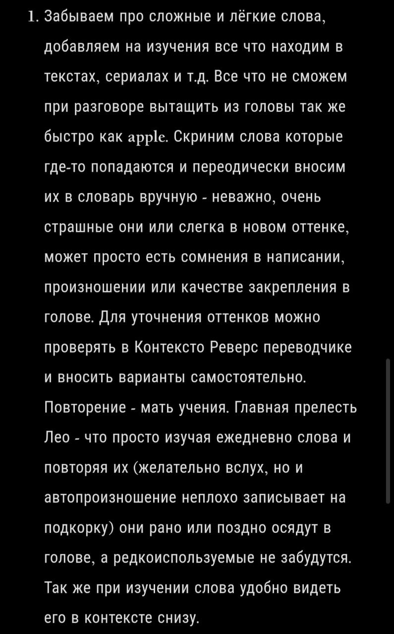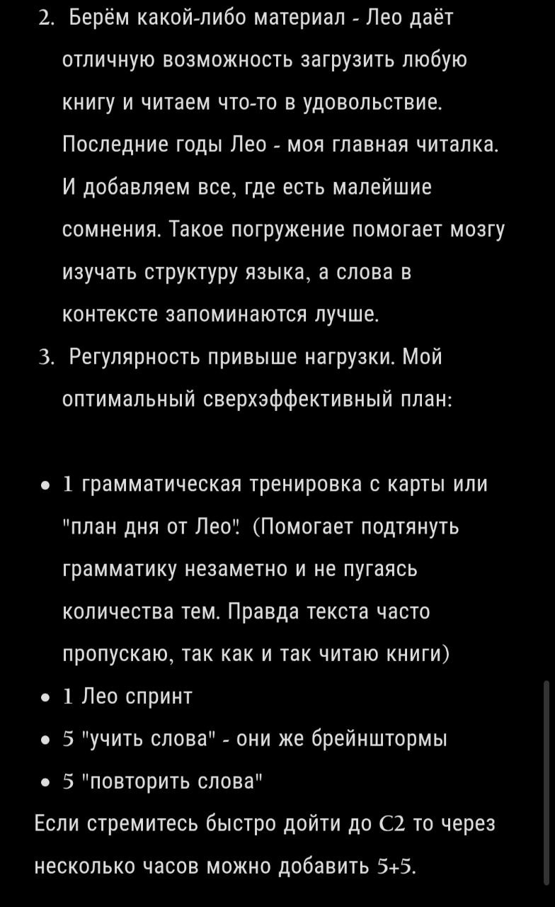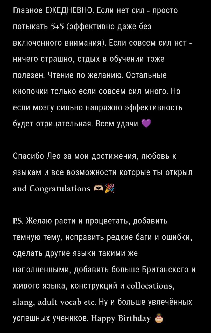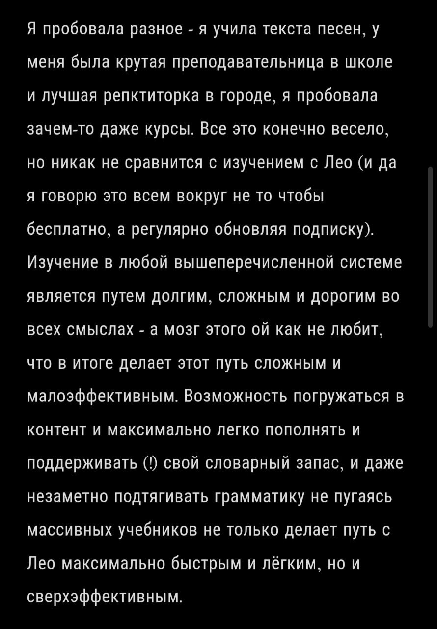 «Берём любой материал — Лео даёт отличную возможность загрузить книги. Последние годы Лео — моя главная читалка. Добавляю все слова, в которых есть малейшие сомнения. Погружение помогает мозгу изучать структуру языка, а слова в контексте запоминаются сами».